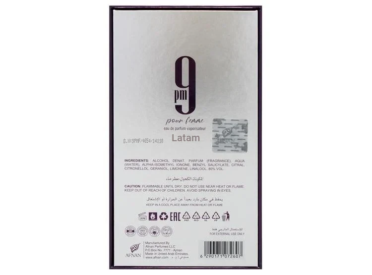 En Latam Fragrances seleccionamos fragancias auténticas que destacan por su calidad, estilo y presencia olfativa. 9PM Pour Femme Eau Parfum 100 ml es perfecta para mujeres que buscan un perfume femenino, duradero y con una esencia envolvente que realza la personalidad con naturalidad.
